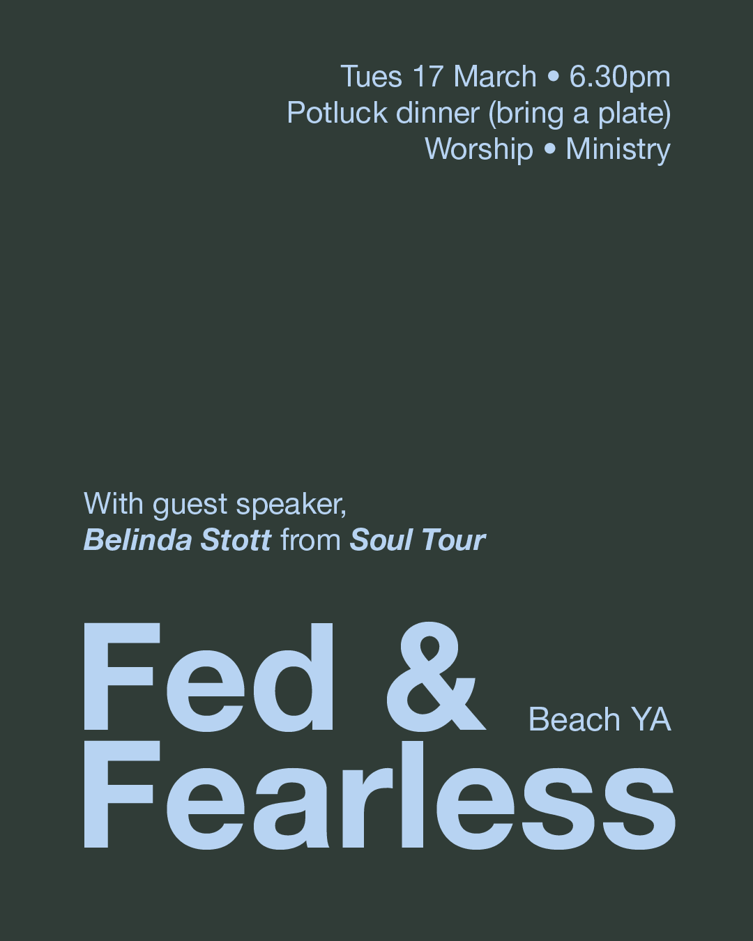 Ditch your regular Lifegroup routine - We’re gathering the whole Beach YA crew for a one-off night of community, worship, and deep-diving into what it looks like to live a life with less fear!